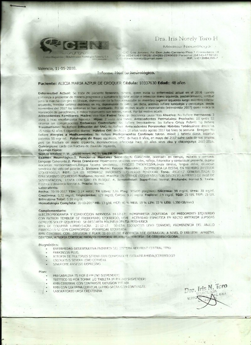 Hello, my name is Alicia Azpur, I am currently 53 years old, but 7 years ago I was diagnosed with a (benign) brain tumor, which is the cause of my headaches, I have multiple systemic atrophy in the cerebellum, Parkinson's level 2 and I suffer from high blood pressure, this requires me to take many medications that I cannot afford due to my precarious economic condition, as well as I need a wheelchair with a walker, for this reason I come to you so that you can help me financially to be able to buy it in my country. Next I send you all my medical reports